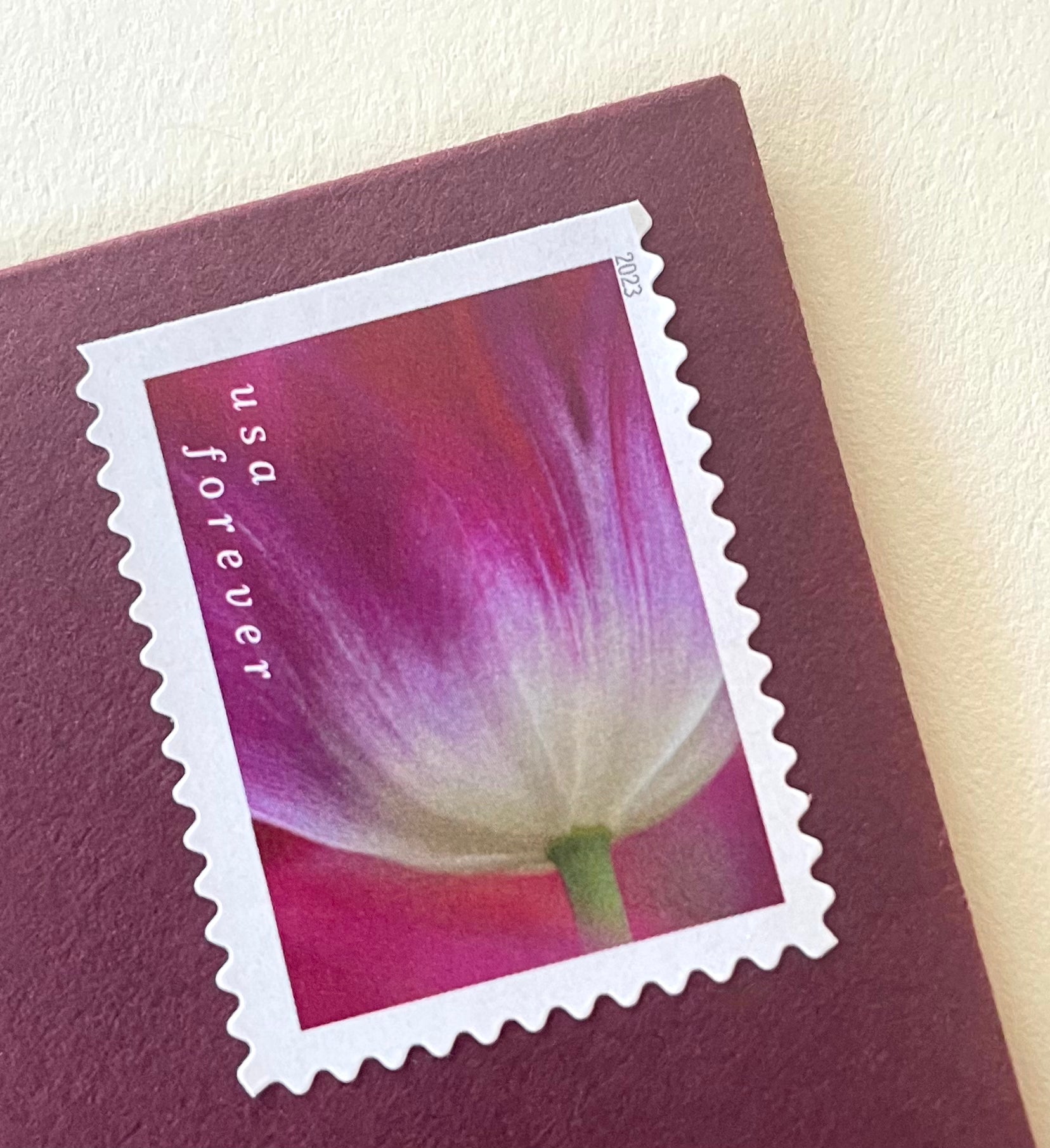 These USPS stamps are perfectly suitable for use as postage at the current Forever 1st class postage rate. These beautiful purple magenta tulip stamps will add an enchanting personalized touch to your garden wedding invitations, save the dates, or cards.