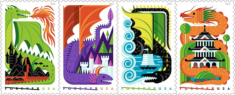 Includes a total of 8 (EIGHT) Dragon Forever Stamps (2 of each design shown).